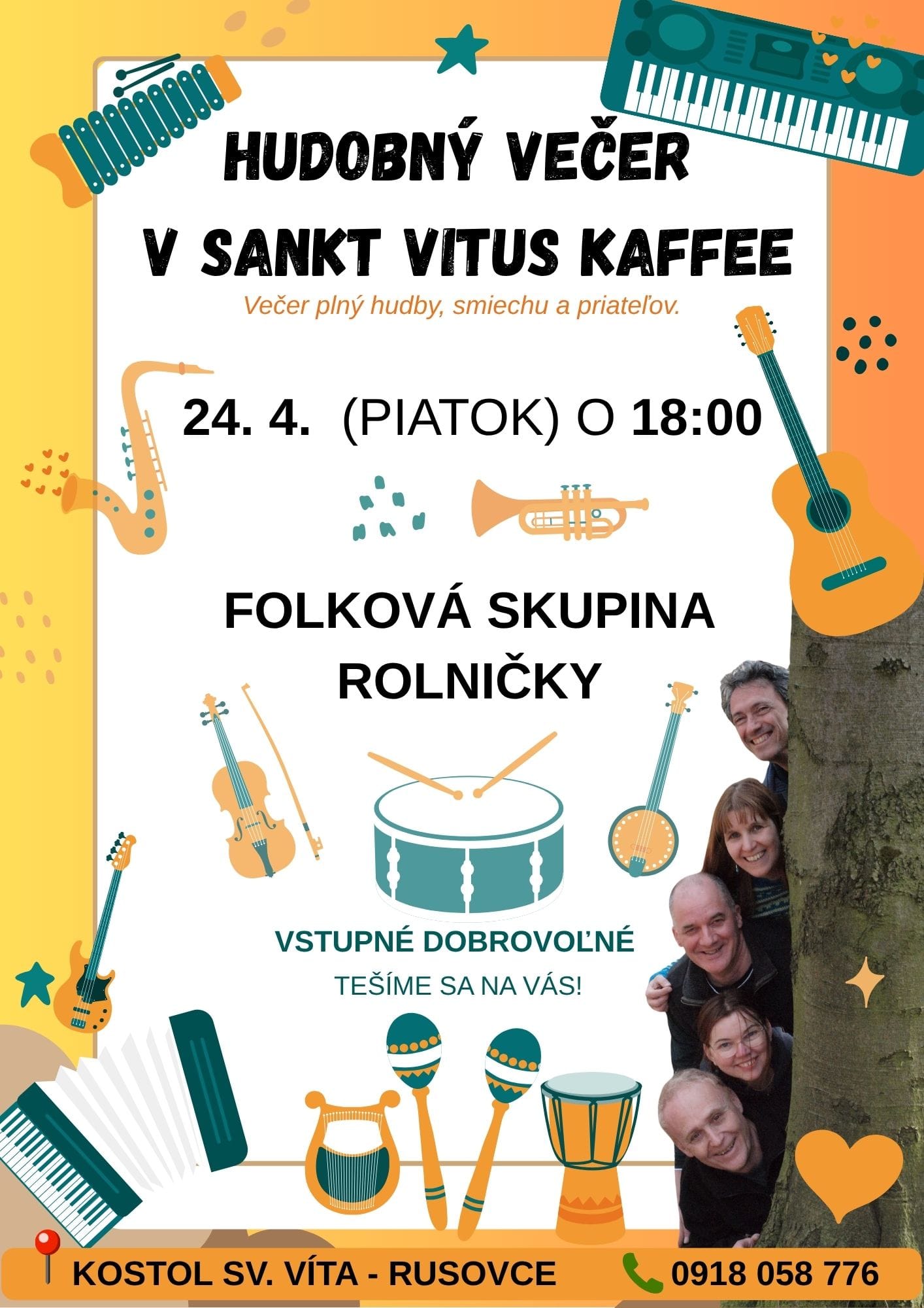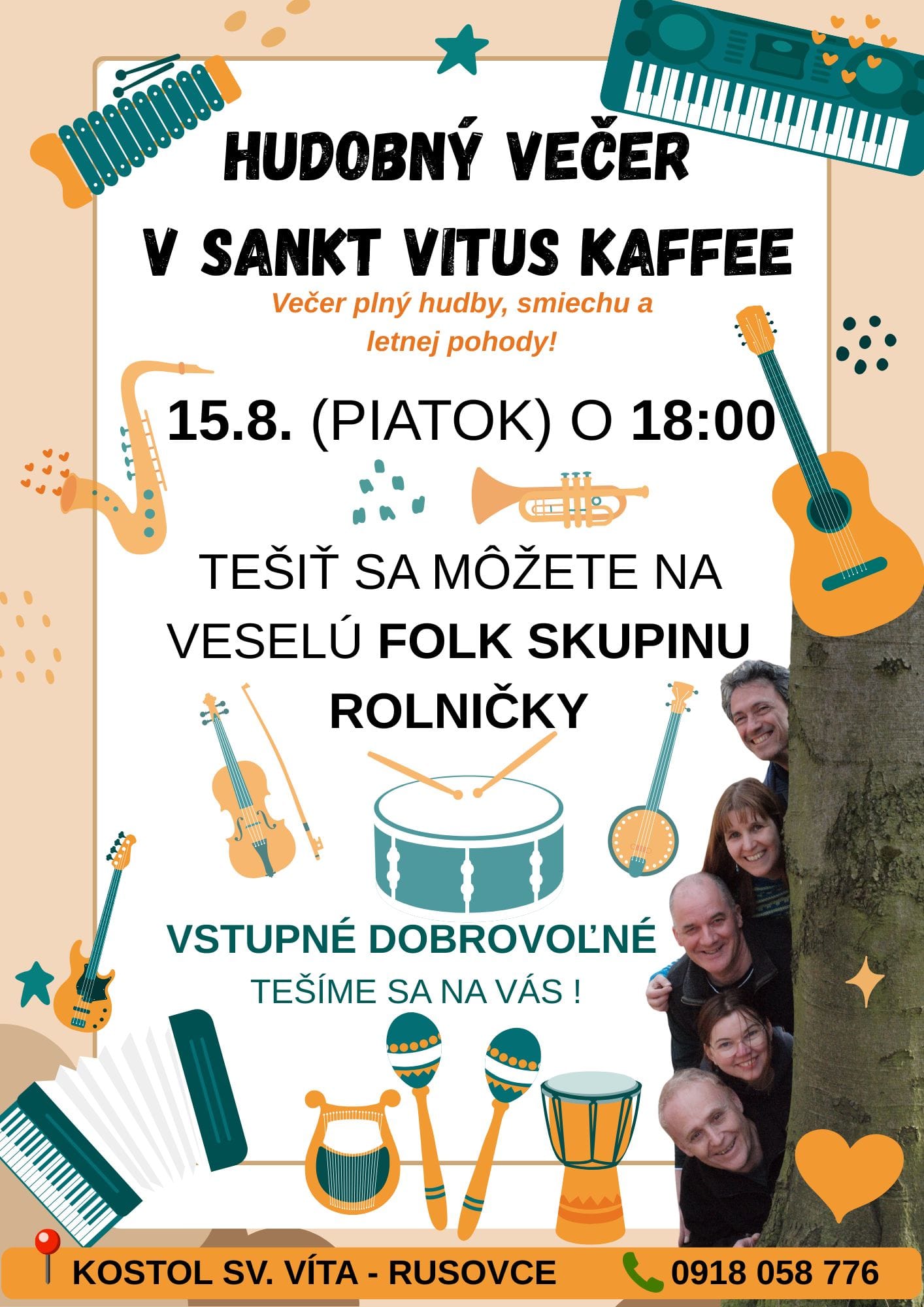 V kaviarni Sankt Vitus Kaffee v kostolíku v Rusovciach sme stihli už dva razy hrať v krásnom prostredí a pre výborné publikum. Čo sme nestihli? Ochutnať tamojšiu kávu, na ktorú tam vraj chodia ľudia zo širokého okolia a najmä legendárny zákusok „Kardinál.“ Sme šťastní, že sme dostali ešte jednu šancu. Pozývame vás popočúvať a zaspievať si s tridsaťpäťročnými Rolničkami a zamaškrtiť, samozrejme, v prestávkach medzi pesničkami, pretože mľaskanie, ktorému sa pri tých dobrotách ťažko vyhnúť, by nás mohlo vyviesť z rytmu.